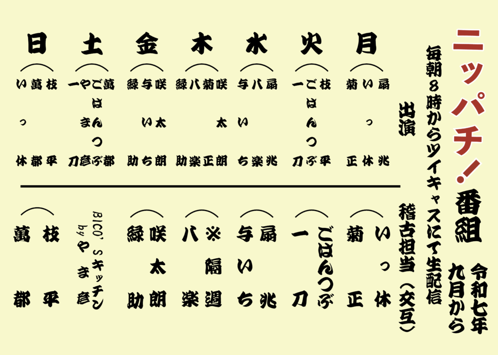 春風一刀、柳家緑助、林家やま彦、春風亭与いち、三遊亭ごはんつぶ、林家八楽、古今亭菊正、春風亭いっ休、三遊亭萬都、入船亭扇兆、林家咲太朗、桂枝平