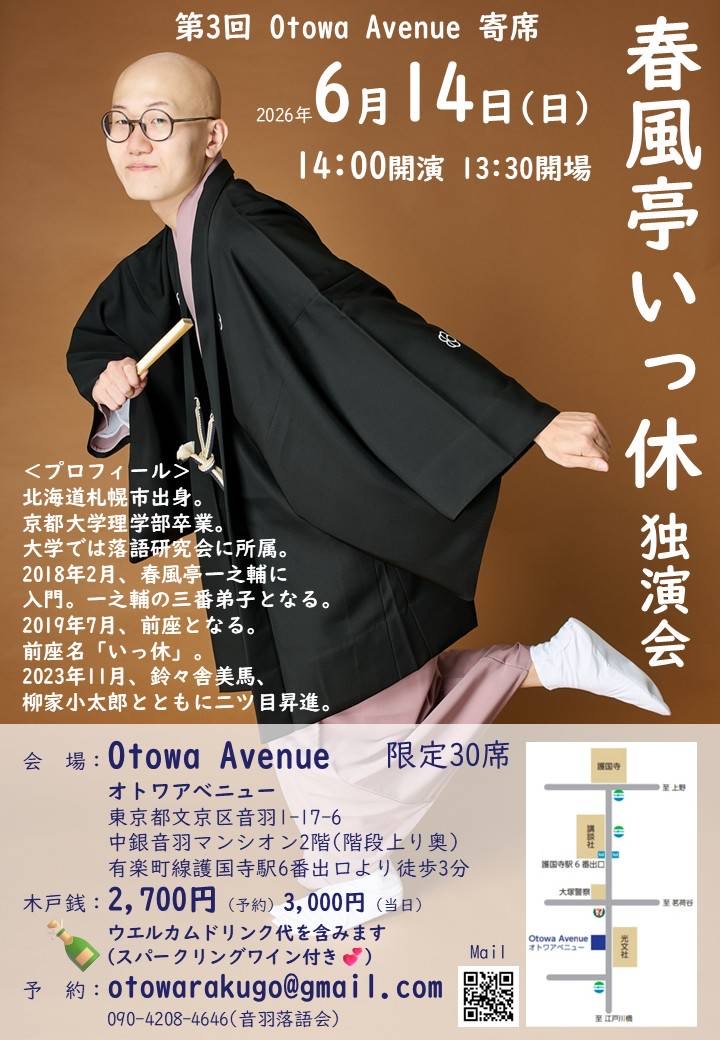 [東京] 6/14(日) 第3回OtowaAvenue寄席 春風亭いっ休独演会