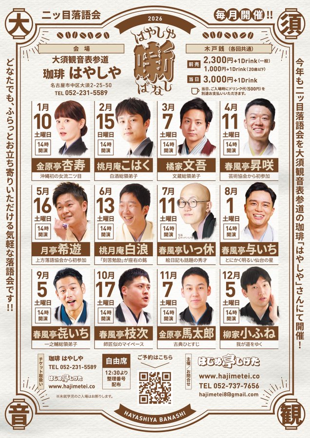 名古屋での落語会 はじめ亭しげた 落語会の開催、運営をお手伝いします。 日本の伝統芸能である落語を絶やさず、国内の若手噺家を世界に紹介する役割を担っています。